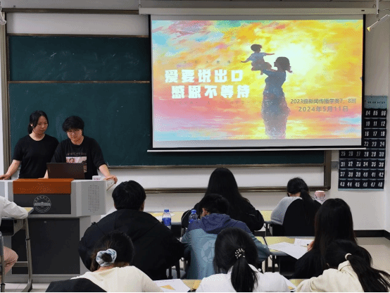 “同學們,猜一猜明天是什么節日?。俊薄澳赣H節!”5月11日,新聞傳播學類專業2023(7)、(8)班在K202教室開展以“愛要說出口,感恩不等待”為主題的團建活動。活動開始前,活動負責人、新聞傳播學類專業2023(7)、(8)班的班長楊雨霏、朱研溪提前為每位同學準備好信紙和信封。朱研溪說:“我們希望通過寫信這種傳統而深情的溝通方式,讓同學們勇敢表達自己的心聲,將對母親的愛訴說于筆尖?!睂W生們觀看一段關于母愛的感人短片后,...